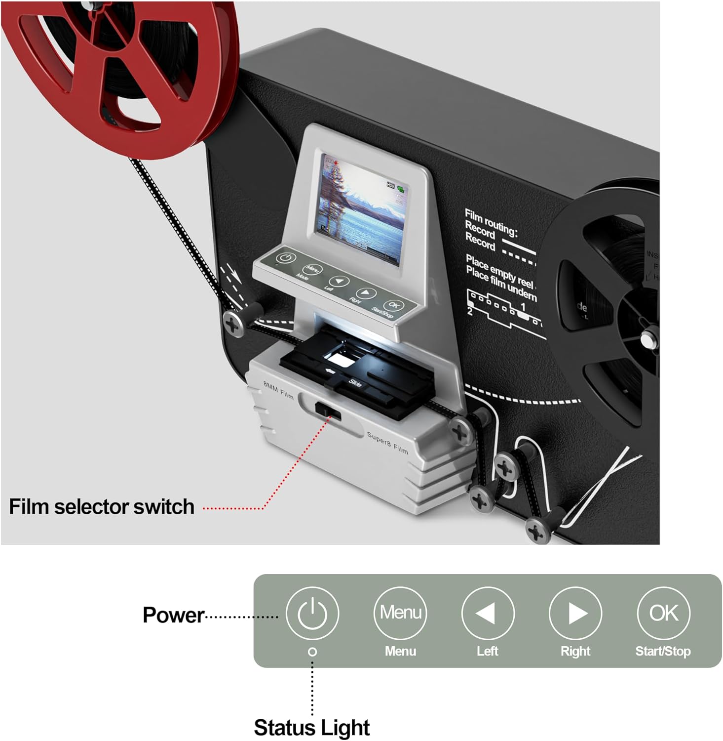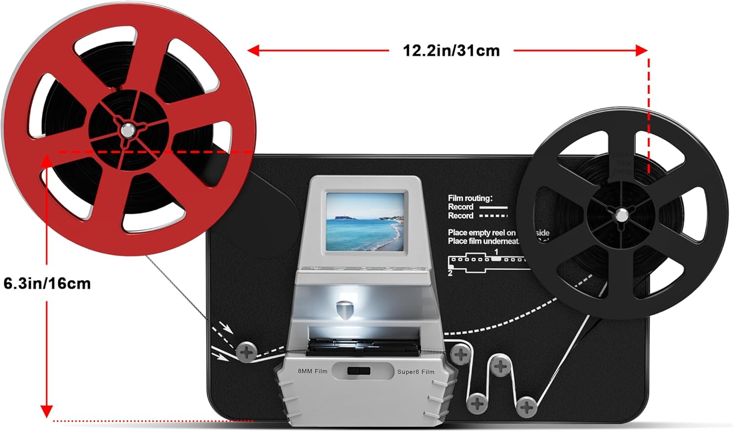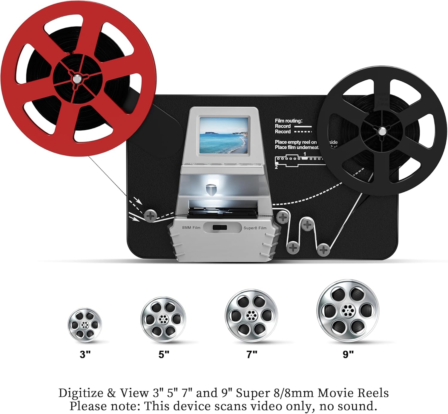 • Supports Multiple Reel Sizes: Compatible with 3”, 5”, 7”, and 9” film reels, this versatile Super 8 film converter works with most standard home movie collections. Perfect for digitising archived film reels and converting 8mm film to digital without professional equipment.