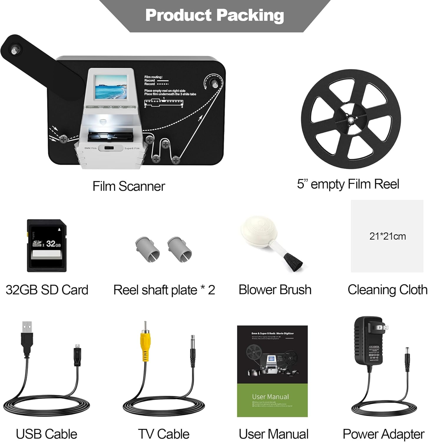 • Complete Conversion Kit – Ready to Use: Everything you need to start digitising your film collection straight out of the box. This 8mm and Super 8 film scanner includes a 5″ empty film reel, 32GB SD card, USB cable (31″), power adapter, RCA TV-out cable (39.3″), reel shaft plate, cleaning cloth, and user manual, allowing you to begin converting film to digital quickly without needing additional accessories.