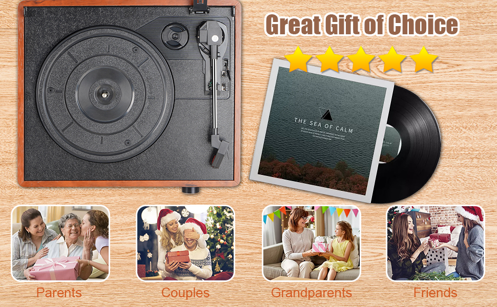 Easy to use, simple setup and operation. Great ideal for vinyl lovers. Three-speed Turntable (33, 45, 78 RPM) plays all of your 7″ 10″ 12″ vinyl records.TIPS:When placing a 12-inch vinyl record on the turntable, gently tilt it toward the tonearm to ensure proper playback.